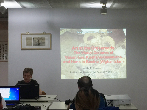 乐仲迪教授乐教授作为一个历史史家,对考古图象方面具有非常浓厚的兴趣,并深入研究图像在文化的交流背景下的意义,包括在这种跨文化的交流中所产生的文化和社会之间的相互影响、相互借鉴与创新的关系。乐教授从大的历史背景作为切入点,通过展示不同时期的出土的艺术品,给大家做出了深入的解读。从伊朗的遗址和大流士大帝的墓葬艺术讲起,其中包括贵霜金币、萨珊银盘以及浮雕等,充分展示了希腊化在大夏产生的影响以及西方、罗马、印度之间的跨文化交流。