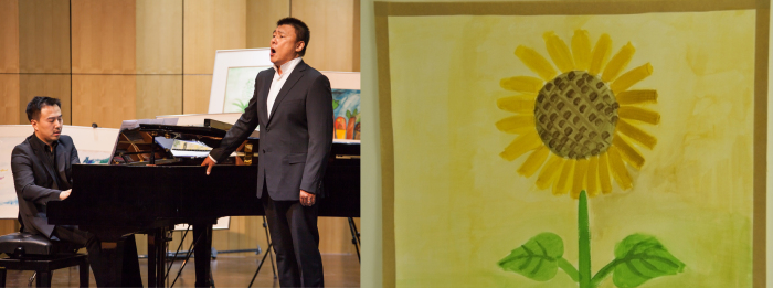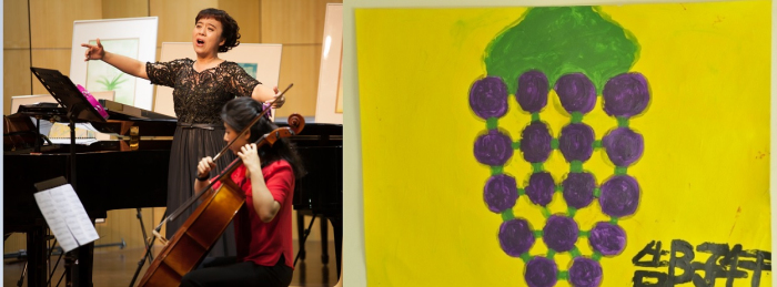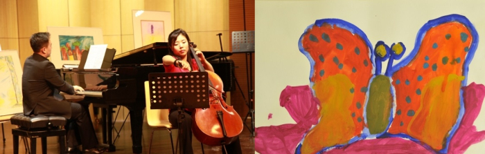 女高音杨明明老师与钢琴弦乐三重奏《一杯美酒》,以及郜子轩小朋友的有感画作。