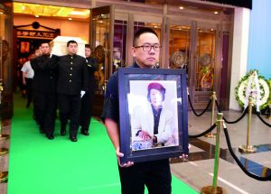 徐悲鸿之孙徐冀怀抱奶奶廖静文遗像走出告别厅。