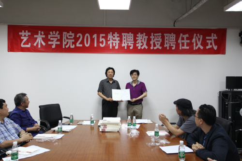 2015特聘教授聘任仪式在学院会议室举行,聘任著名专家学者丁杰先生为学院特聘教授。执行院长丁方教授、绘画系主任黄华三教授、副主任王家增教授及部分青年骨干教师参加了此次仪式。