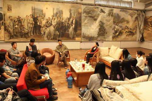 老党员沈尧伊教授主讲。院党委副书记别敏副教授及学员们一同前往宋庄沈教授的画室。