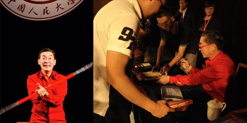 演讲持续两个小时,现场气氛愈加热烈,同学们意犹未尽。应现场观众的热情邀请,六小龄童在现场耍起了金箍棒,演示了美猴王的经典动作,炉火纯青的表演立刻将观众带入到《西游记》的记忆当中,掌声和欢呼声迭起。与观众交流和互动之后,六小龄童在现场开展了图书签名活动。