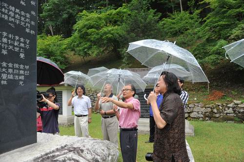 图08 中国书法家代表团考察韩国著名古寺松广寺。韩国.圆光大学宣柱善教授(前排右2)为中方代表团介绍韩国的碑文
