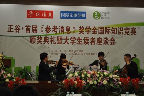 2010年11月5日下午,“正谷·首届《参考消息》奖学金国际知识竞赛颁奖典礼”在新华社新闻大厦多功能厅隆重举行,应新华社参考消息报社邀请,我院团委书记郝丹丹老师带领音乐系的数名同学为该颁奖典礼带来一场高水准的精彩演出,受到了新华社领导和全体观众的高度评价和热烈欢迎。