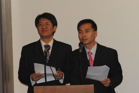 开幕式上,辛正承大使、金荣基会长、申万胜副主席、徐庆平院长分别代表各方致词。辛正承大使谈到在中华人民共和国建国60年之际,他欣喜地看到中韩两国间的文化艺术交流蓬勃发展,同时也认为本次展览将进一步扩大中韩两国书法界的交流,为两国国民创作更受喜爱的文化艺术作品而贡献力量。金荣基会长代表韩国书家讲话,他深信本次展会中37位韩国书家和45位中国书家的参与,将是回顾中韩书法文化史,摸索今后发展方向的大好契机,其意义影响深远。徐庆平院长指出“中韩书法名家邀请展”今年已是第4届,它的举办旨在构建韩中书法高层学术交流平台,搭建两国老中青书法家互相交流、互相学习、发展友谊的桥梁,延续韩中文化的历史友谊和共同血脉,为全球化时代东方文化的复兴和传播做出努力。申万胜副主席代表中国书法家协会对本次展览表示祝贺,他对“中韩书法名家邀请展”在一定数量两国名家参展的基础上,不断推出新人的做法表示赞赏,衷心希望展览能够成为韩中两国不同阶层书法家、书法爱好者互相沟通、学习的桥梁。