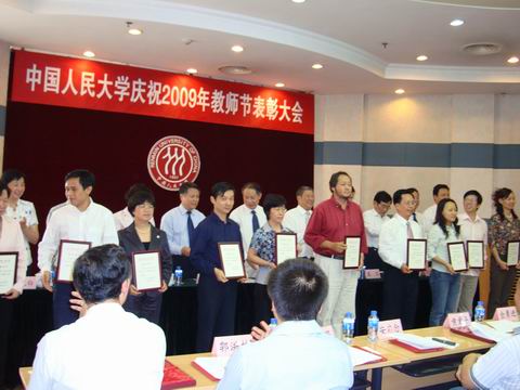 庆祝2009年教师节表彰大会在学校逸夫会堂隆重举行。纪宝成校长、程天权书记、袁卫常务副校长、牛维麟常务副书记、林岗副校长、冯惠玲副校长、马俊杰副书记、陈一兵副校长、陈雨露副校长、薛浣白副校长出席大会,受表彰教师代表、从教三十年的教职工代表和受表彰单位负责人与学校各职能部门负责人、学院负责人、教师代表等参加了表彰大会。