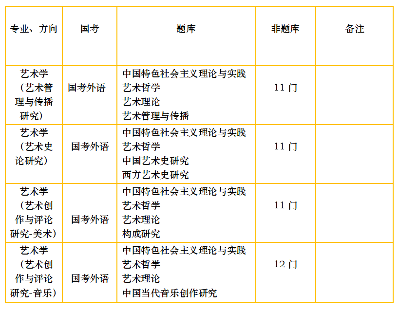 现行艺术学专业下设方向考试科目一览表如下,请各位学员知悉