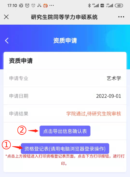 审核通过,学员即可登录系统下载打印资格登记表(见下图标记1位置),贴二寸蓝底纸质证件照片,单位填写推荐意见,盖章,更详细的步骤要求见附件二填表说明。