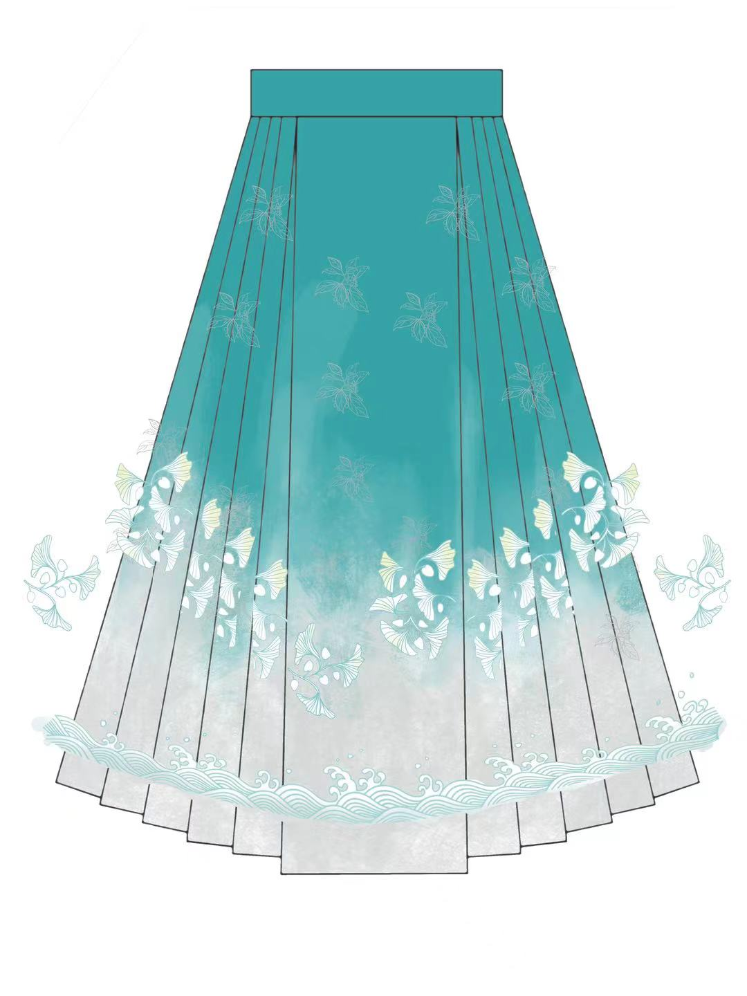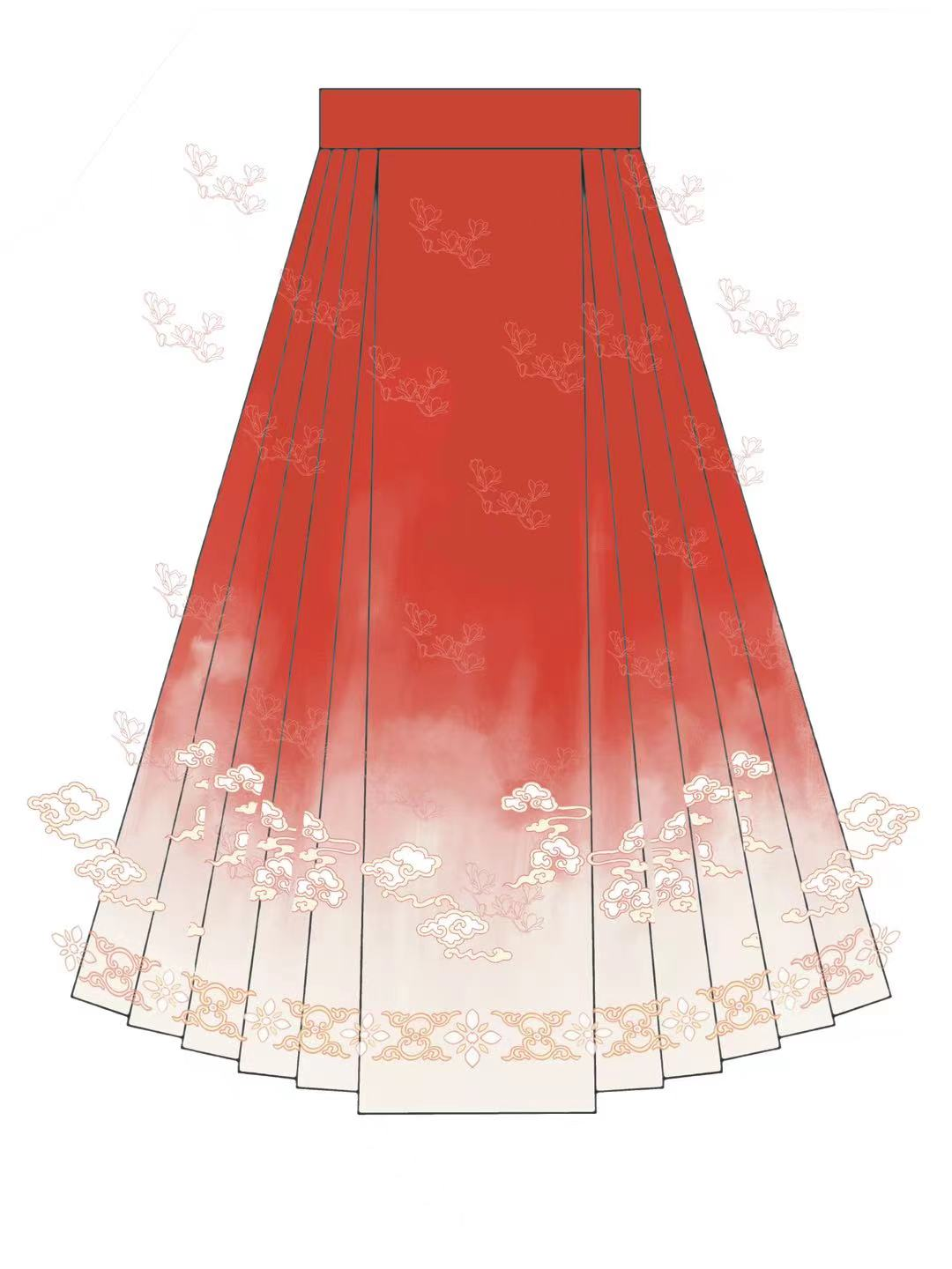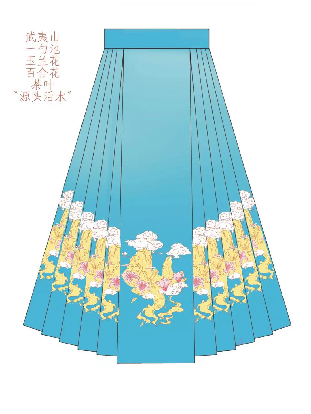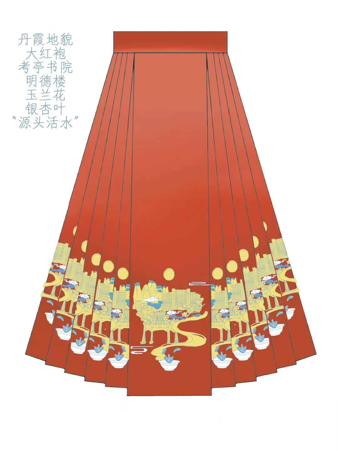 马面裙设计的颜色从纯色变成了水墨渐变,同时还去除了堆积的具体元素,将关键元素提炼为纹样符号表达,多种元素融合于“平雨青山”和“丹霞赤色”的云雾氤氲之中。