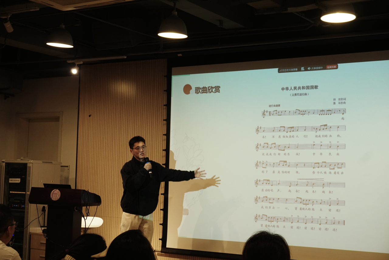 “歌声中的党史”美育思政微课将九·三阅兵时演唱的7首歌曲转化为“大思政课”鲜活教材。李坤泰、李增信、杨皓月、辛予溪、韩康等多位广场合唱团成员结合自身演唱感悟,为同学们详细讲解了《太行山上》《歌唱祖国》等7首歌曲的创作背景、过程及艺术手法。他们以声情并茂的讲述,引领同学们穿越时空,走进经典红色歌曲背后的峥嵘历史,打造出一堂别具一格的“音乐党史课”。