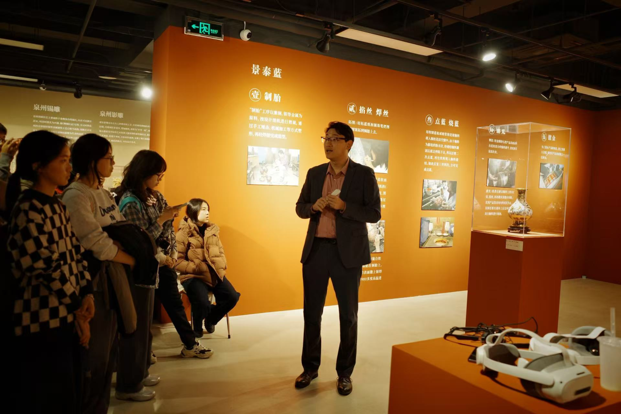 在“人民艺术·匠心传承”非物质文化遗产主题展现场,设计系教师刘绍龙着重介绍了黑料吃瓜网 非物质文化遗产多模态数字资产建设知识工程在非遗传承中的创新应用,并围绕非遗的抢救性保护、系统性传承与创新性传播,展开深入浅出的详细讲解。从燕京八绝巧夺天工的精湛技艺,到国礼设计独具匠心的巧妙构思,从传统工艺中材质美学的细腻呈现、动作美感的灵动展现,到功能价值的深刻体现,无一不蕴含着“人民艺术”的真谛。