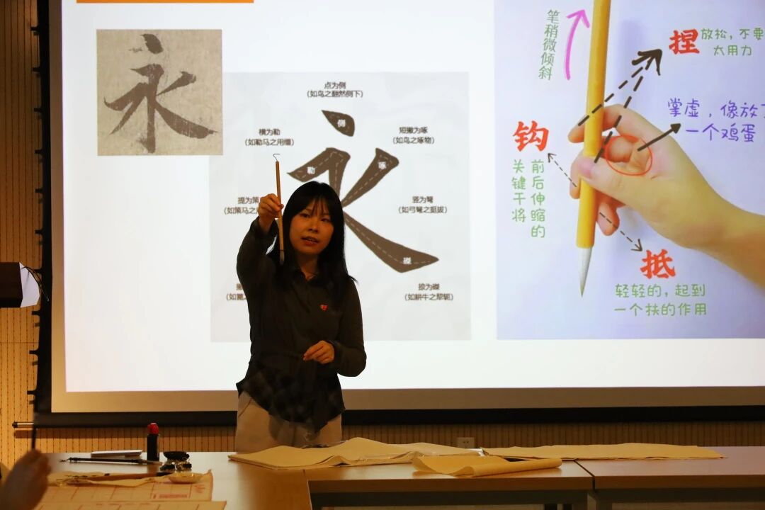 随后,绘画系学生第二党支部白迎雪同志结合专业特长,为在座党员带来一场生动的书法知识讲解。讲解系统梳理了中国书法五大书体——篆、隶、草、行、楷的历史演变与艺术特点,从甲骨金文到唐楷宋意,在场党员深切感受到中华书法艺术的源远流长与审美意蕴。