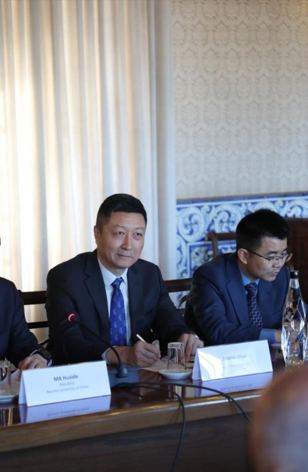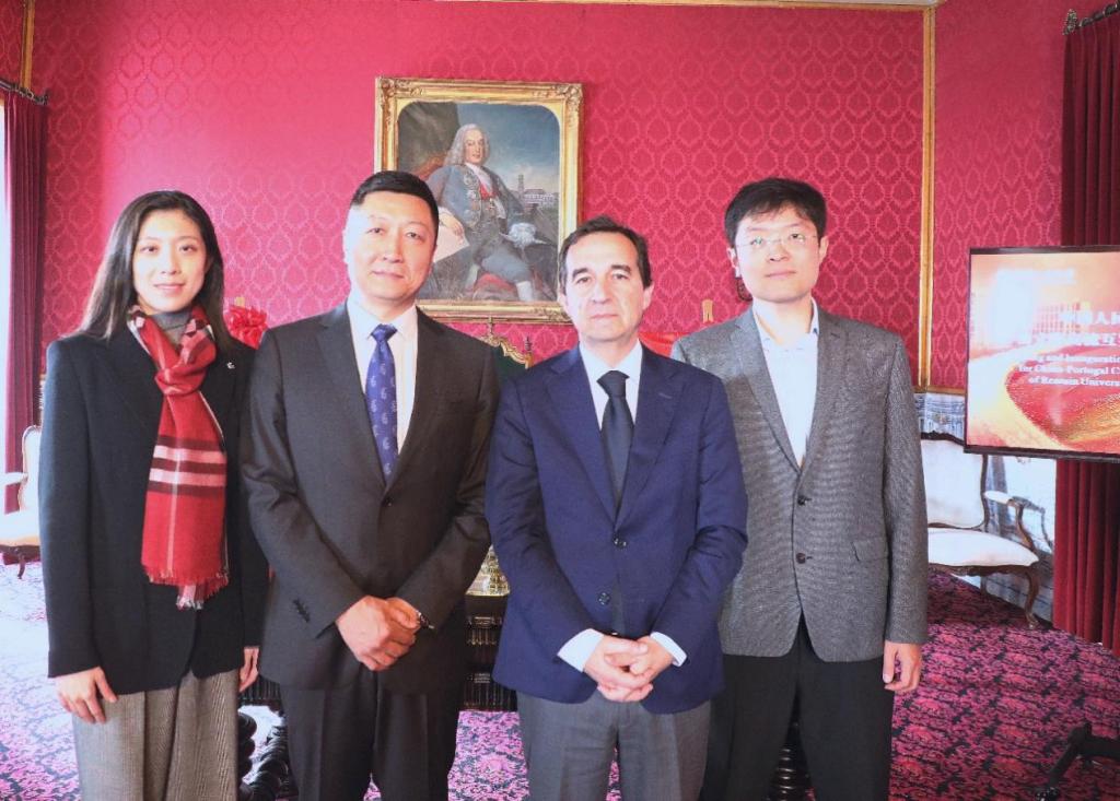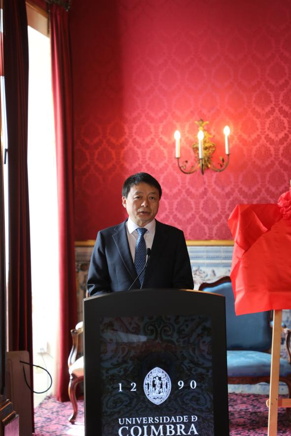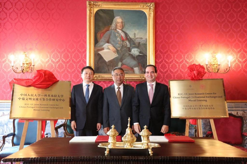 校长马怀德、中国驻葡萄牙大使杨义瑞、科英布拉大学副校长若奥·努诺·卡尔文·达席尔瓦出席仪式并致辞,共同为中葡文明交流互鉴合作研究中心揭牌。