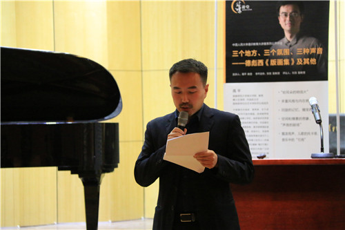 2018年是克洛德·德彪西去世一百周年。本次讲座高平教授以德彪西为主题,通过对其钢琴曲作品《版画集》的可视化诠释,为大家描述了一个不同于人们传统印象的德彪西形象。德彪西钢琴作品《版画集》包括三部分,分别为运用东方音乐形象的《塔》、伊斯兰风味的《格拉纳达之夜》和借鉴法国民谣的《雨中花园》三个乐章。高平教授巧妙地运用“给耳朵的明信片”作为比喻,指出三个乐章像是三张从不同的地方寄出的明信片,表现出了德彪西音乐作品中独特的异域情调。此外,高平教授通过现场演绎德彪西的作品,认真细致地解读了《版画集》中的借鉴元素和表现出的独一无二的创造性。