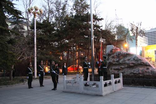 大雪将及,冬至未至,瑟瑟寒风,天色未明。彻骨的寒意抵挡不住我院16级同学的谆谆家国情怀,意气风发的丹青赤子们于6:40分已整齐列队于国旗台两旁参加庄严的升旗仪式。6:50分国旗护卫队主持赵泽堃宣布升旗仪式正式开始。首先,国旗护卫队队员魏湛卓向全体新生宣读了《国旗法》。在他的解读下同学们了解了国旗法维护国旗的尊严、发扬爱国主义精神的重要作用。