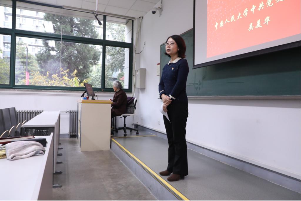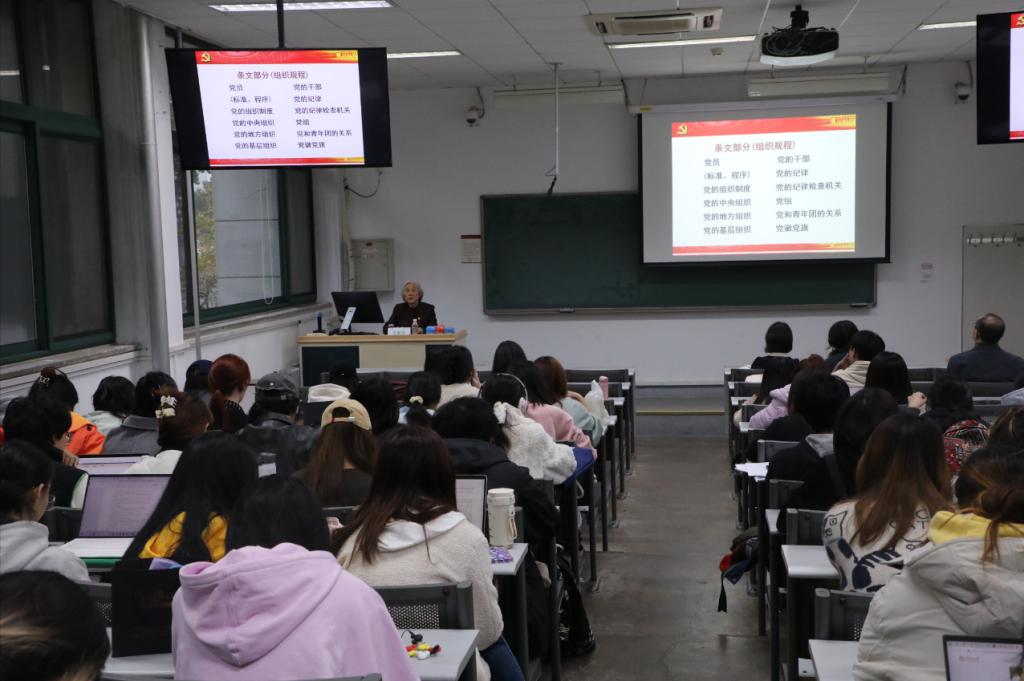 吴美华教授带领大家学习了现行党章原文的总纲及部分条文,引导各位党员及入党积极分子加深对党的性质、宗旨、奋斗目标、指导思想、基本方略、组织制度与纪律要求等的认识与理解。她还结合现实案例为大家解读了党员的权利与义务,指导各位党员依照党章规定合理合规维护自身权益,正确认识和处理义务与权利、责任与担当的关系,坚持行使权利与遵守纪律辩证统一。