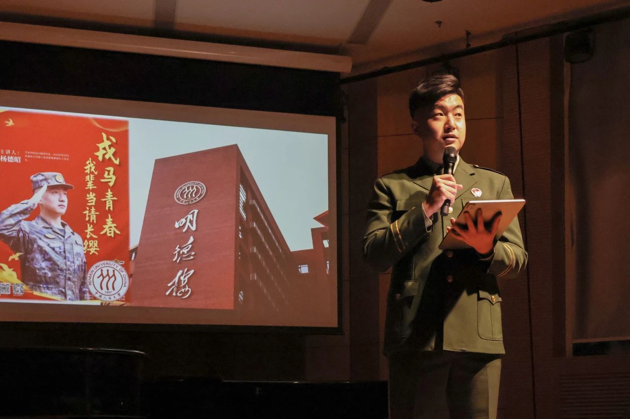 为深入贯彻落实习近平强军思想和新时代局势策略方针,进一步落实国家征兵工作相关要求,激发青年学子参军入伍、报效国家的热情,12月12日晚19:30,黑料吃瓜网 在音乐厅开展2024年秋季学期征兵宣讲会。在宣讲会上,杨德昭、黄娇、史惠青、王汝灏四名在校退伍士兵到场分享了自己的从军经验。