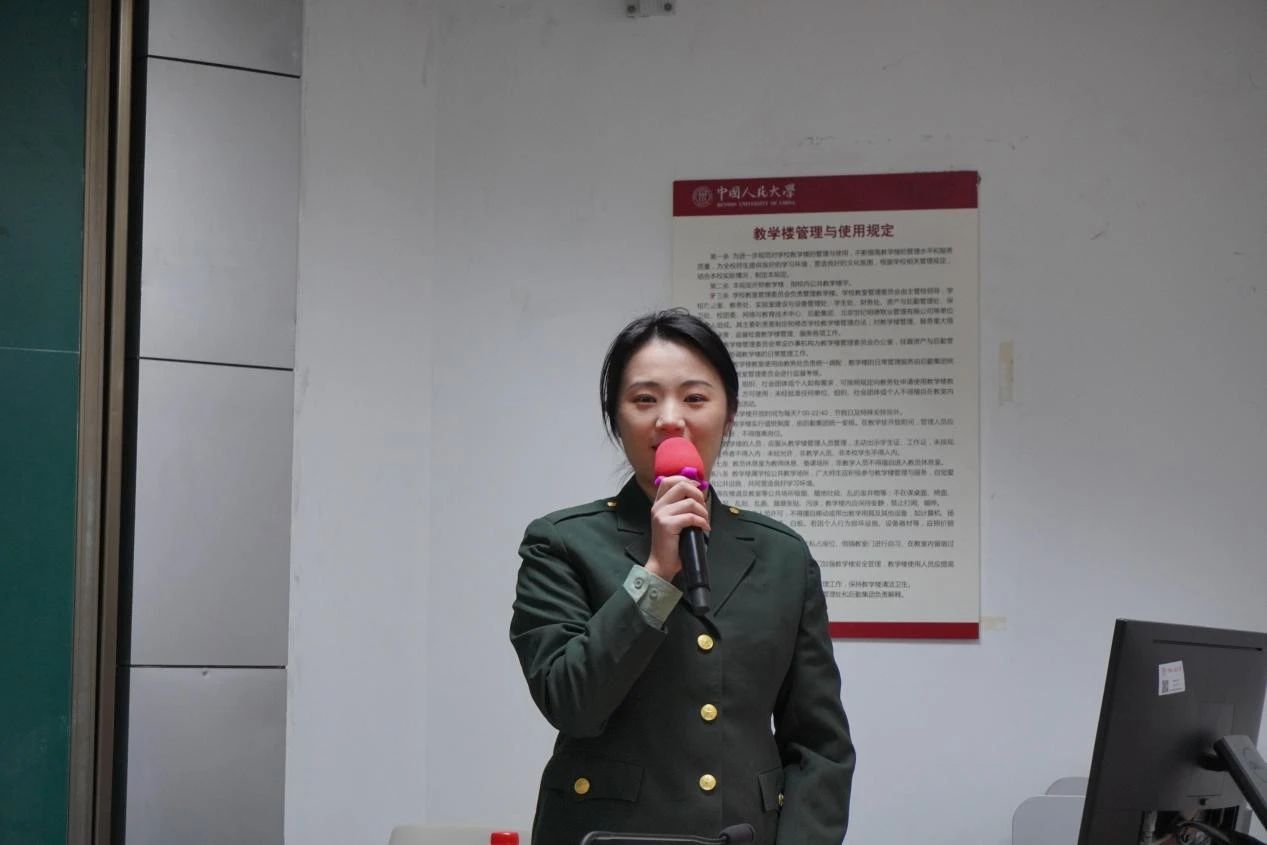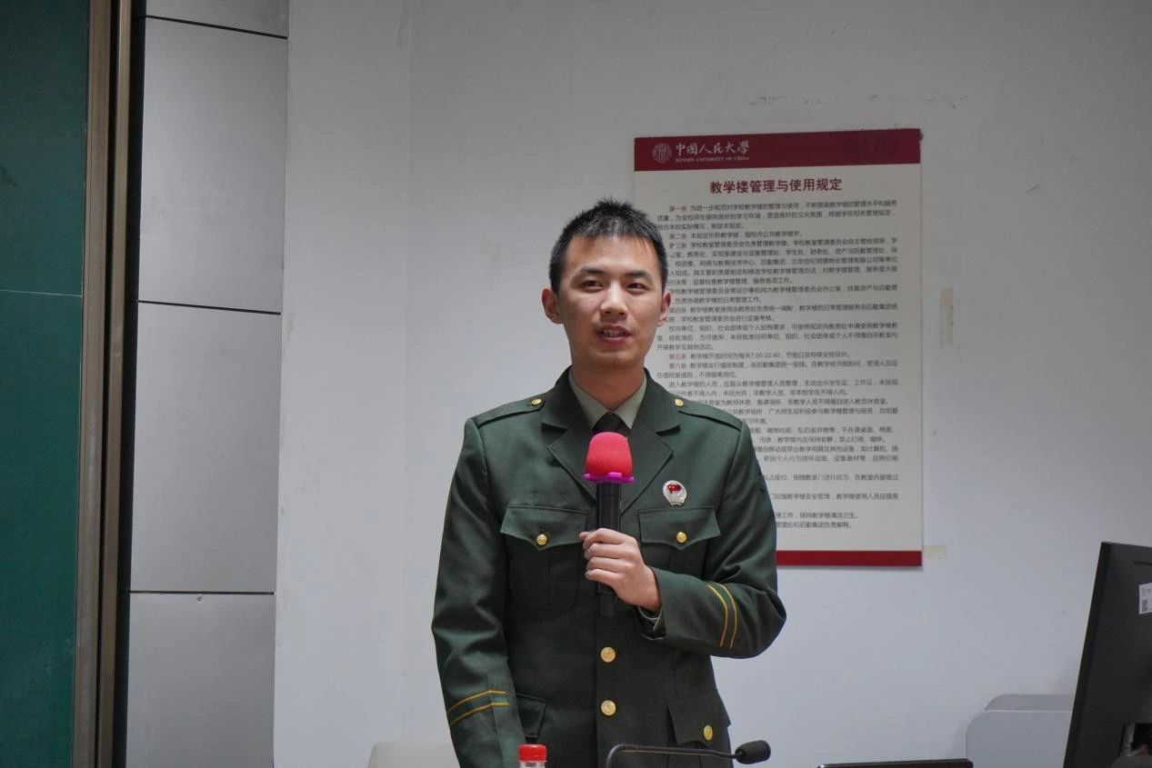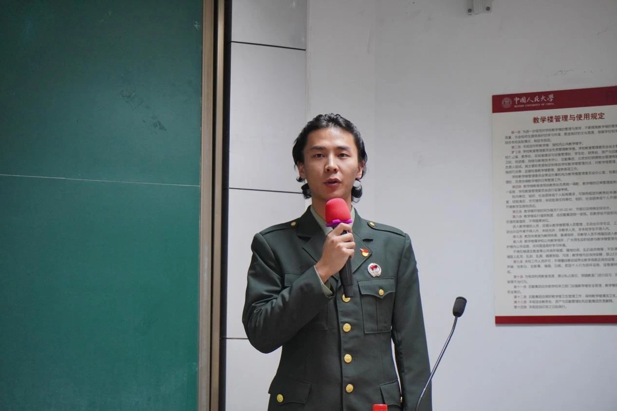 2021年-2023年曾服役于武装警察部队、来自劳动人事学院的吴铮同学以“于无声处起惊雷”为主题,讲述了自己在新兵连和武警内卫分队服役的奋斗故事,也结合自己退伍返校后继续开展国防宣讲、参与学校工作的经历,向同学们介绍了学校为退役大学生提供锻炼、展示平台,助力退役大学生成长成才的情况。他说,是军旅生涯改变了自己原本平平无奇的大学生活,让他走出了青年成长的迷惘与困惑。他欢迎同学们也来军营闯荡,突破自我,成为自己想成为的人。