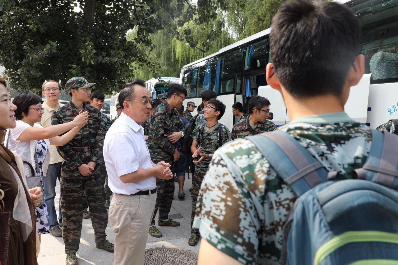 党政领导班子高度重视此次军训, 8月22日早上7时45分,别敏、陈光曦、隋洁老师和学生会为整装待发的戎装学子送行,并在世纪馆北门台阶合影,老师们谆谆叮嘱各项事宜,陈光曦老师和隋洁老师作为带队教师,一路随行,悉心教导、陪伴学子们。