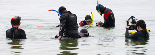 我院动画专业的“没有围墙的课堂”,在实现走出课堂的基础上,强调学生跨学科的学习经验积累。法尔茅斯大学的海洋地理水下摄影的专业位列英国该专业领域第一名,拥有丰厚师资队伍和技术支持,此次的水下摄影项目由该专业的学科主持人盖娜教授、布郎教授以及该专业的优秀毕业生负责一对一实践教学。