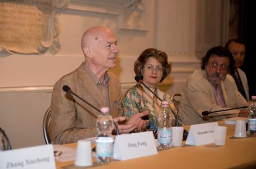 执行院长、文艺复兴研究院院长丁方教授与意大利佛罗伦萨原博物馆总局局长Cristina Acidini、意大利艺术研究院绘画院院长Andrea Granchi、佛罗伦萨美术学院教授Sandro Bellesi、佛罗伦萨大学教授Isabella Gagliardi、卢卡高等研究院教授Emanuele Pellegrini、卡拉拉美术学院教授Gerardo de Simone等分多个主题展开了一系列深入对话。丁方说,“东方文艺复兴”的使命是文化寻根,通过研究、借鉴西方文艺复兴的经验,来探寻中华民族之根、复兴中华民族精神;当初西方文艺复兴尚未触及到的东方(波斯/印度/中国)的古代精神资源,如今正沿着古代欧亚大陆通道“丝绸之路”隆隆迫近,凝聚成东方文艺复兴的理念而逐渐发光。