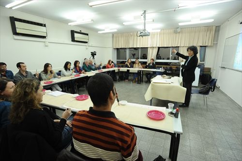 开幕式后,特拉维夫大学孔子学院书法课程教学开始。郑晓华给学生示范执笔