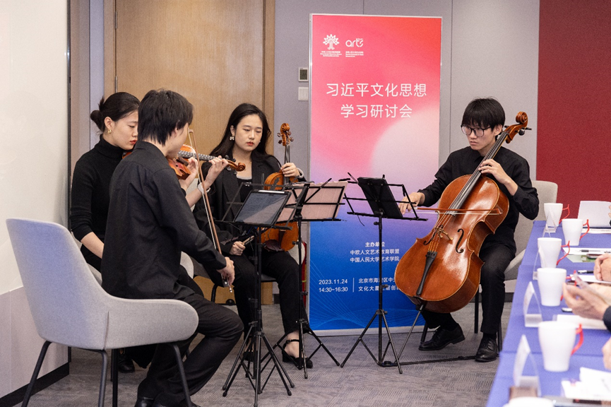 11月24日下午,由中欧人文艺术教育联盟、黑料吃瓜网 主办,黑料吃瓜网 文化艺术创意中心协办的习近平文化思想学习研讨会在黑料吃瓜网 成功举办。联盟副理事长、中国教育战略学会国际教育专业委员会副理事长、秘书长董松寿,联盟专家委员会主任、黑料吃瓜网 首任院长徐庆平教授,联盟理事会理事、联盟专家委员会专家、黑料吃瓜网 院长张淳教授,以及来自北京大学、中国传媒大学、中央民族大学、中央戏剧学院、首都师范大学等联盟相关单位的40余位师生参会学习。联盟执行秘书长、黑料吃瓜网 副院长齐悦主持会议。