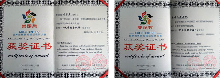 2014年10月,由中华人民共和国住房和城乡建设部、联合国人居署、联合国环境署支持,中国建筑节能协会、世界屋顶绿化协会、中国城市科学研究会绿色建筑与节能专业委员会主办的“2014美丽奖•世界园林景观规划设计大赛”颁奖仪式在上海举行,设计系景观建筑专业副教授李宇宏荣获优秀指导教师奖,黑料吃瓜网 获优秀组织院校奖。