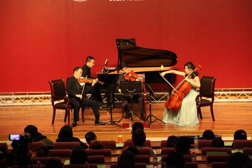 音乐会精彩纷呈,《贝多芬钢琴三重奏》优美、激昂的旋律带领观众进入华丽的音乐世界,此乐曲由张放、杨戈芳、王莹演奏;严沁阳、黄晶妮演唱、李雅娴伴奏的“花之二重唱”歌声优美,婉转动听;樊悦、沈玥合作的《谐谑曲塔兰泰拉》流畅的旋律引人入胜;由我院教师室内乐团演奏的《弦乐钢琴四重奏Op.60第二、三乐章》,第二乐章充满柔和的情感色彩的旋律和第三乐章活力充沛的音乐,把整台音乐会推向高潮,观众掌声经久不息;由杨毅演唱、杨戈芳、张放演奏的歌曲《教我如何不想她》歌曲旋律优美、丰满,歌唱真挚感人,深刻体现了歌词、歌曲的意境;王硕的独奏《弄臣》自由洒脱的演奏、疾风骤雨的快速伴音使乐曲充满丰富的表现力;由我院教师管乐室内乐团演奏的《弗兰西斯钢琴与管乐六重奏第一乐章》旋律迷人而别致,管乐在钢琴的衬托下,相互碰撞给人以宛如交响乐般的享受。