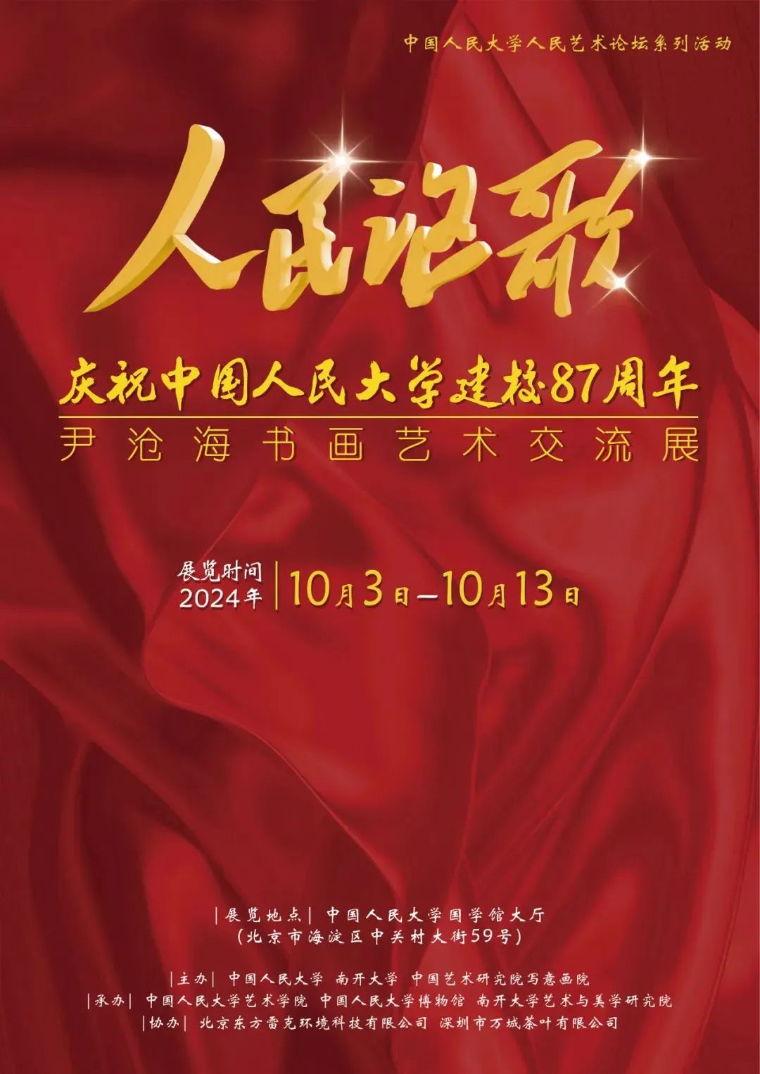 国学馆举行,旨在牢记习近平总书记嘱托,展现尹沧海教授与时代同行、与人民同心的艺术精神,更好发挥艺术举旗帜、聚民心、育新人、兴文化、展形象的深远作用。