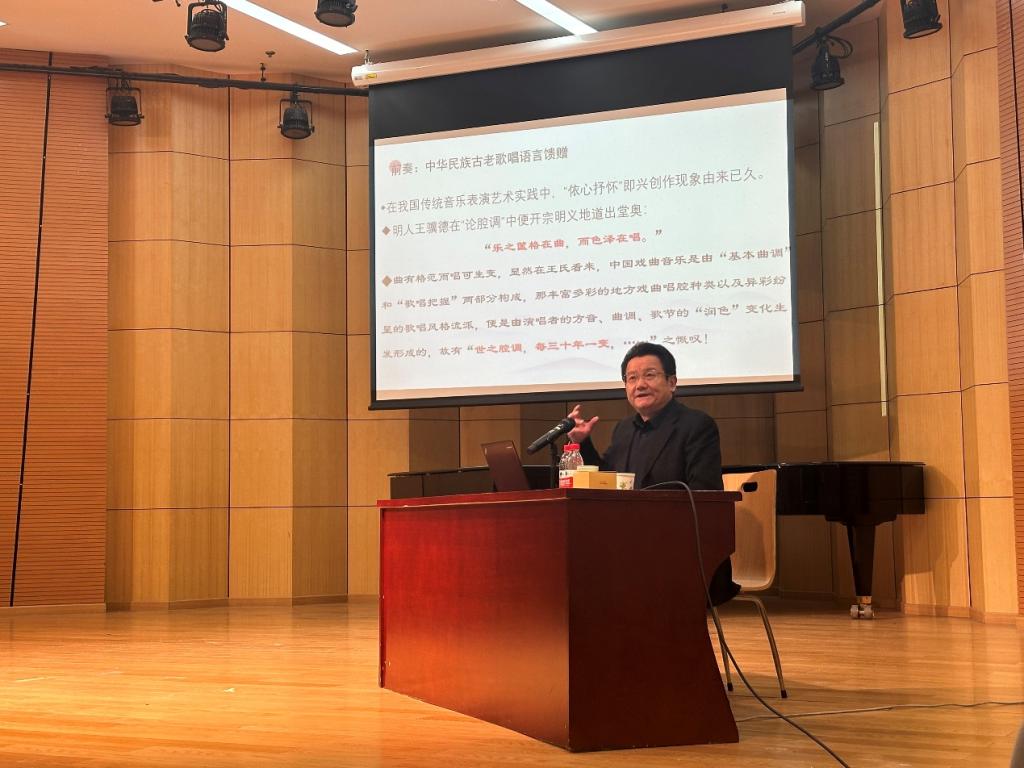 讲座主体内容分“应用导向概念创设”“新时期的有效拓展”“国音学人理论自觉”“三次出版强力推助”“从新世纪到新时代”五部分展开。郭教授细致梳理了中国音乐史上在演唱者“歌唱把握”中显现为中国戏曲音乐艺术细腻生动的个体差异实践(由于地方风格流派、方言、曲调、歌节的“润色”变化)及相关论述,指出这些论述是“润腔”概念提出的萌芽形式,自明王骥德《曲律》“乐之筐格在曲,而色泽在唱”,刘天华记《梅兰芳歌曲谱》“皮黄唱腔、变化甚多,往往同此一句,而个人唱法时有不同”,周大风“要腔”以表唱法对曲调的装饰作用,徐兰沅总结梅兰芳大师表演成就“法中有法”之“小音法”……到于会泳先生提出“润腔”概念,民族声乐演唱的“韵味”概念最终以通约性、普及性、表情传意准确性、科学性的理论得到支持。