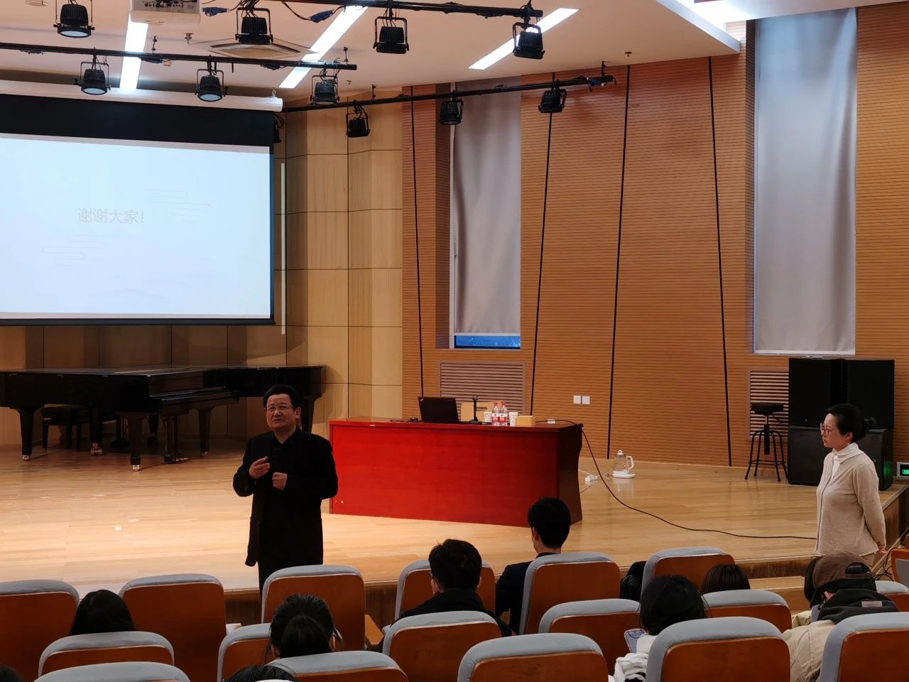 在评议环节中,刘洁教授再次向郭克俭教授表示衷心的感谢。郭教授以谦逊的态度,为我院师生带来了音乐研究领域极具重要性和深度的议题——“润腔”。这一概念的外延不仅局限于某一剧种,而是可以拓展到多种戏曲曲艺剧种的研究中。刘洁教授特别强调了音乐研究从实践出发的必要性,认为音乐表演实践与音乐学研究相辅相成,共同指导构建中国哲学社会科学在音乐文化领域的话语体系。此外,郭教授采用历史思维与方法对史料的挖掘,展现了历史方法在音乐研究中对理论结构化的示范价值。