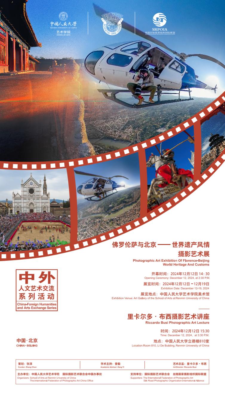 隆重开幕。参展摄影作品汇集了著名中国影像专家、摄影大师周梅生先生,国际摄影艺术联合会主席、著名意大利摄影艺术家里卡尔多·布西先生等多位中国和意大利摄影大师的杰作。展览将从摄影视角展现意大利佛罗伦萨和中国北京这两座历史名城的丰富文化瑰宝和人文风情,为观众呈现一场超越文化和国界的视觉盛宴。届时,意大利驻华使馆代表、国际摄影艺术联合会(FIAP)领导、近30位来自英国、法国、西班牙、德国、澳大利亚等17个国家的中外摄影艺术家和贵宾也将出席。