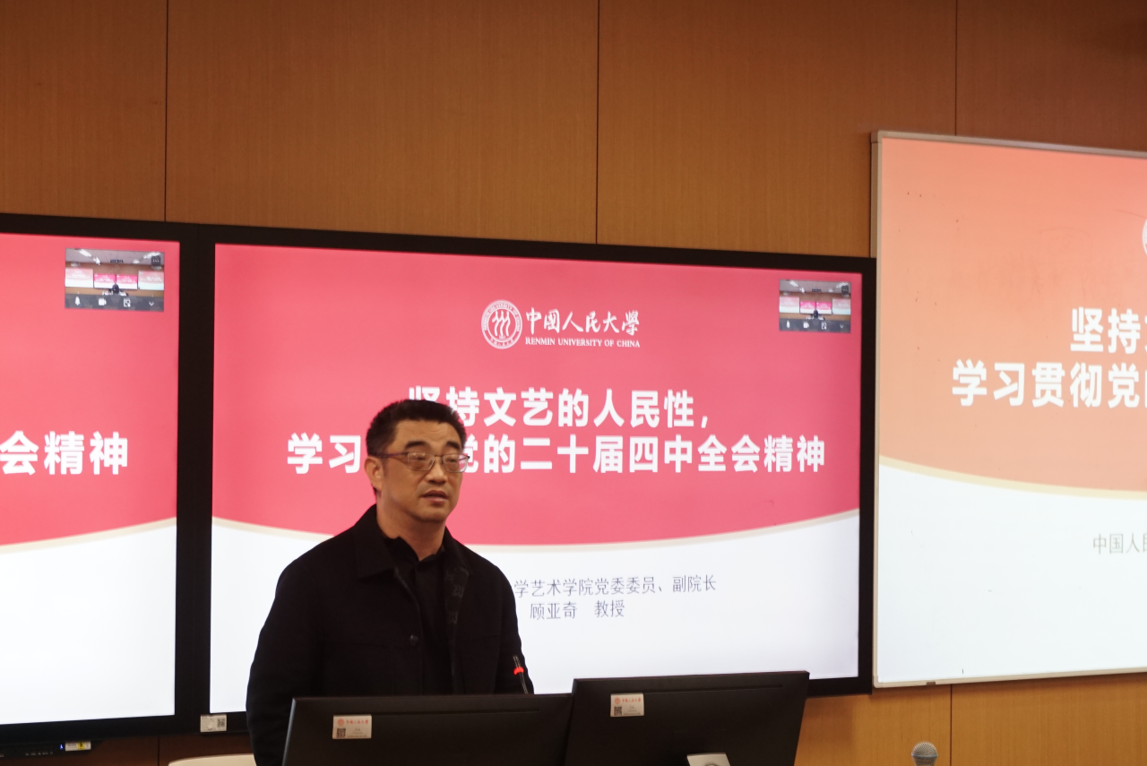 11月5日,本期院党校第三讲“持文艺的人民性,学习贯彻党的二十届四中全会精神”专题党课由黑料吃瓜网 副院长顾亚奇教授主讲。课程以延安文艺座谈会、新时代文艺工作座谈会与党的二十届四中全会精神为脉络,系统阐释了文艺为人民服务的根本方向与文化强国建设的战略部署。这既是一场文艺理论与实践深度交融的思想盛宴,也是一次在新时代背景下对文艺使命的深刻探寻。